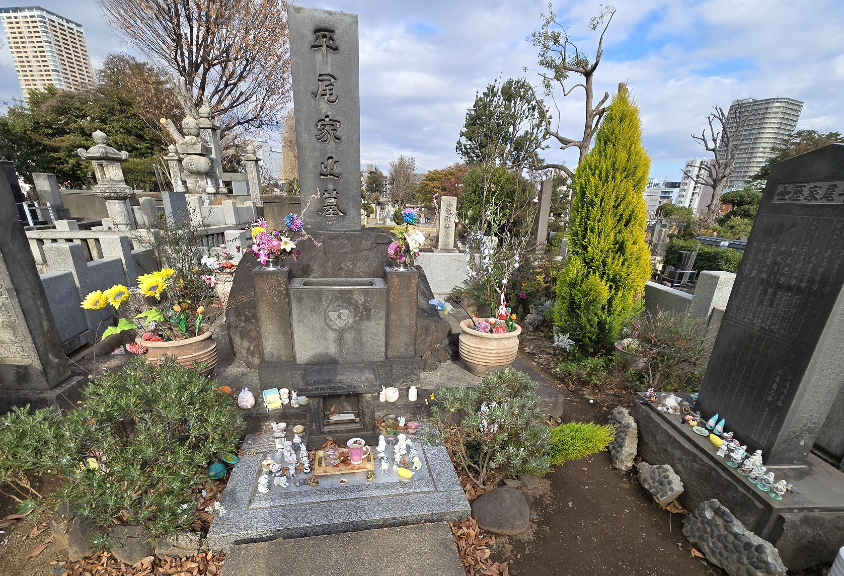日本的墓地很多都有放名片的地方,这样家人就知道有哪些朋友来拜祭过。